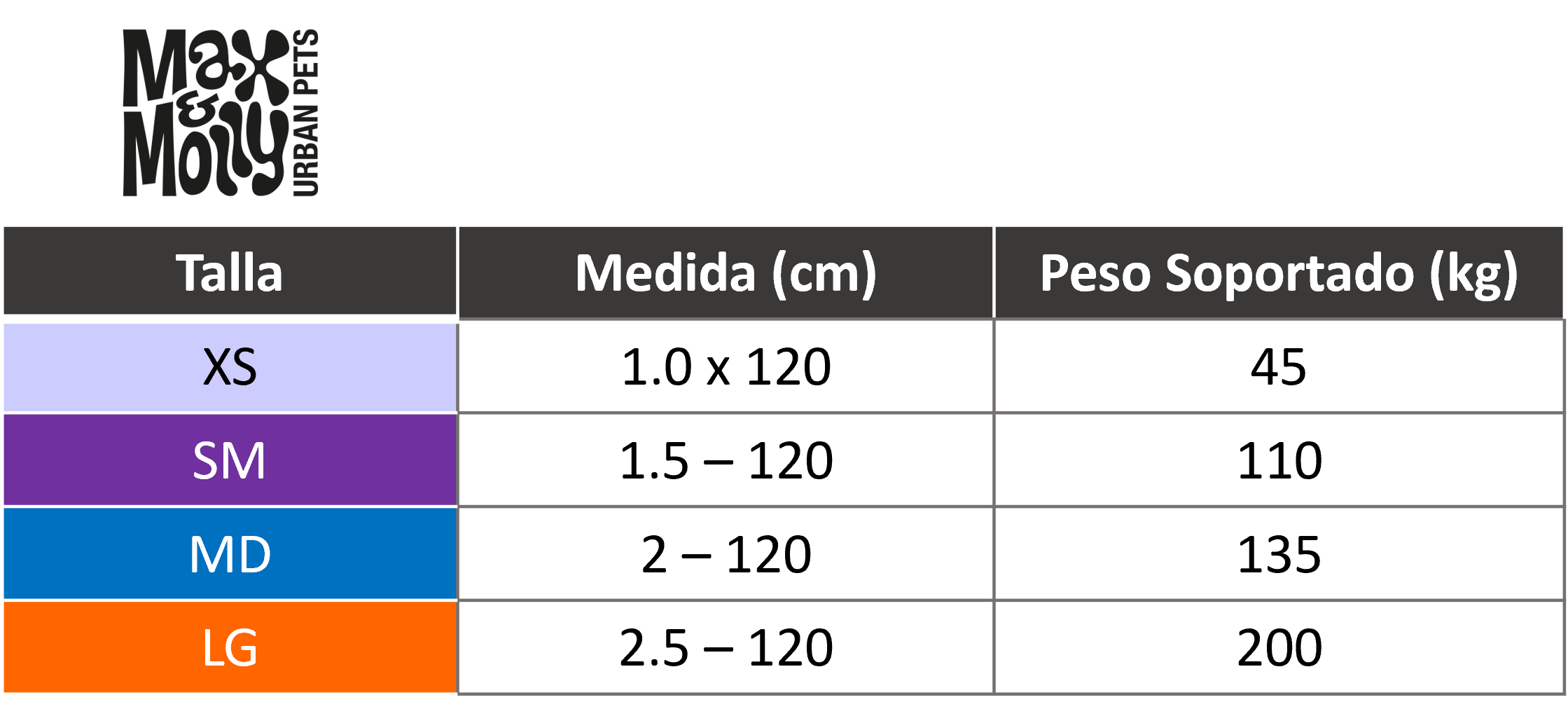 Todos los tamaños miden 4 pies / 1.20 mts de largo.